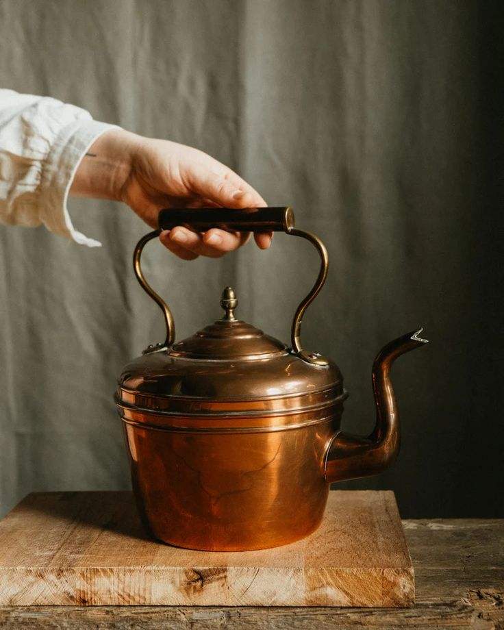 กาน้ำชาทองแดงเนื้อสัมผัสขัดด้วยมือและเงางามอย่างหรูหราสำหรับบริการชาที่หรูหราและรูปแบบการตกแต่งที่ได้แรงบันดาลใจจากมรดก