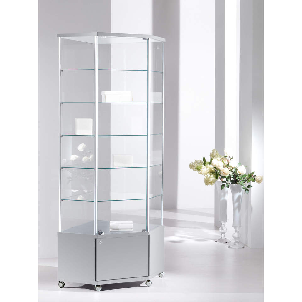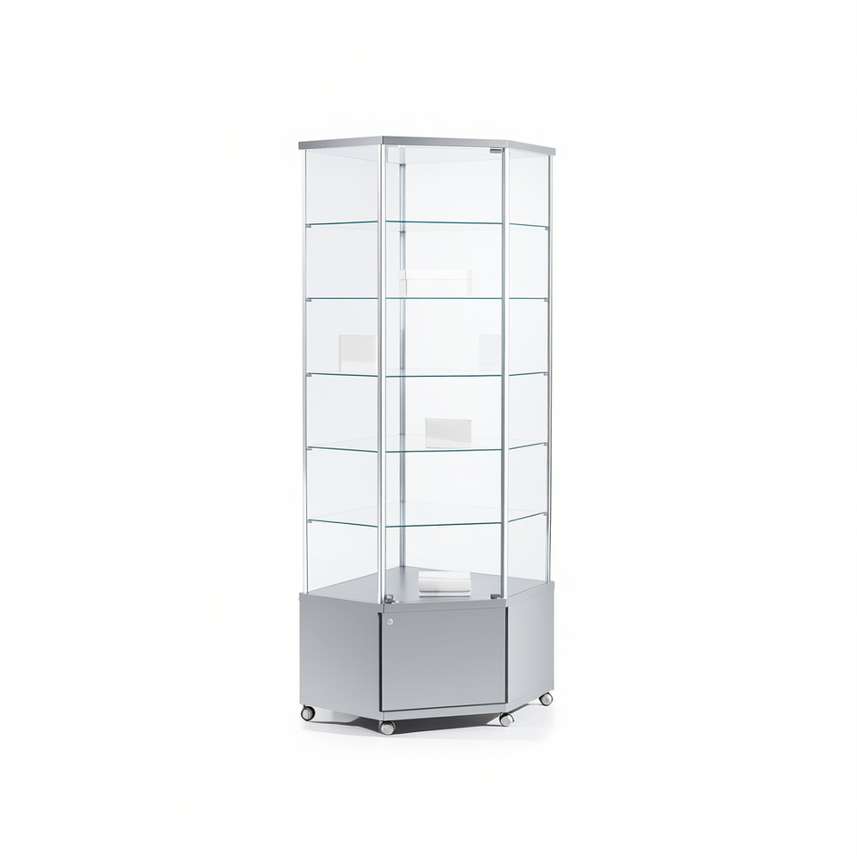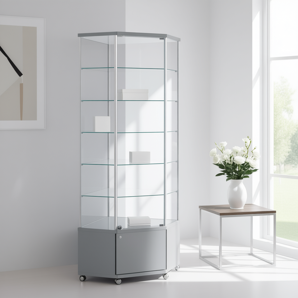 ตู้โชว์มุมโครงอะลูมิเนียม 73x73x220 ซม. สีเทาอ่อน พร้อมกระจกนิรภัยและชั้นวางปรับระดับได้