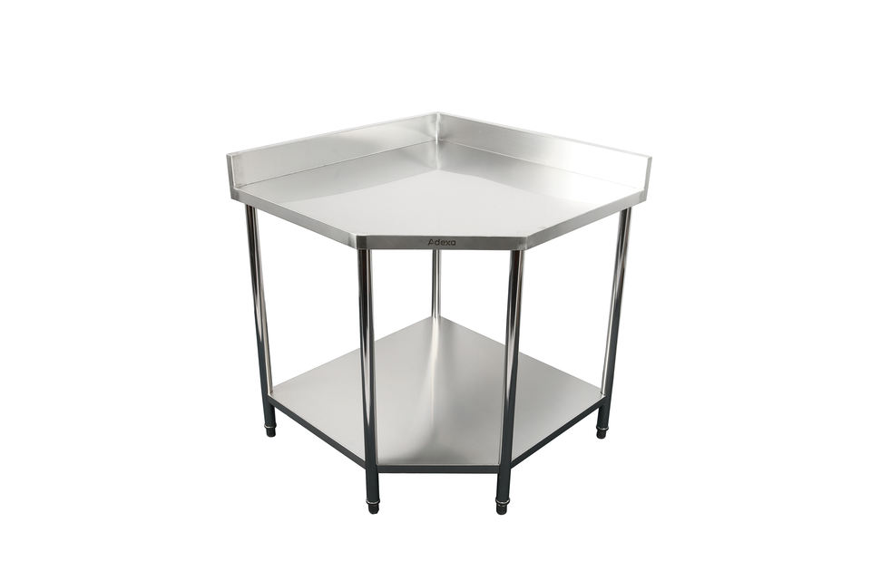 โต๊ะทำงานสแตนเลสแบบมุม โต๊ะเตรียมอาหารสำหรับครัวเชิงพาณิชย์ โต๊ะทำงานโลหะสองชั้นมาตรฐาน NSF พร้อมแผ่นกันน้ำกระเด็นด้านหลัง