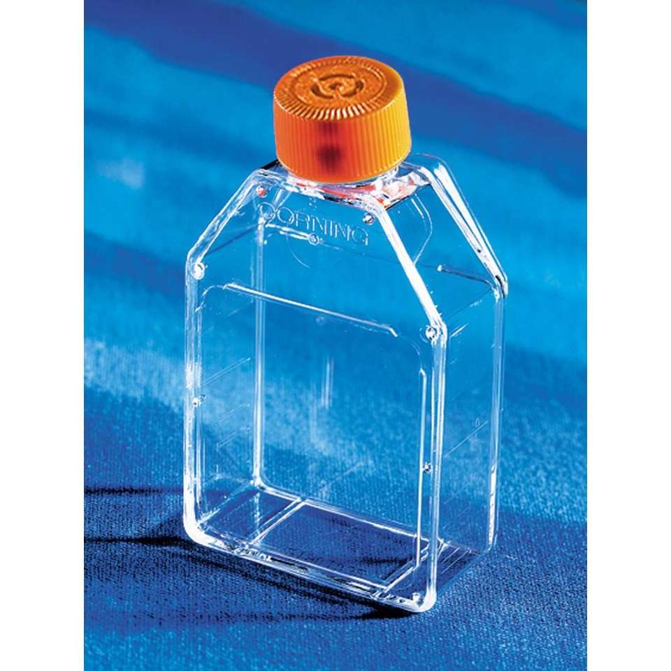 ขวดเพาะเลี้ยงเซลล์โพลีสไตรีนแบบปลอดเชื้อ Corning CellBIND ขนาด 25 ตร.ซม. รูปทรงสี่เหลี่ยมผืนผ้า คอเอียง พร้อมฝาปิดระบายอากาศ ขนาด 10 มล.