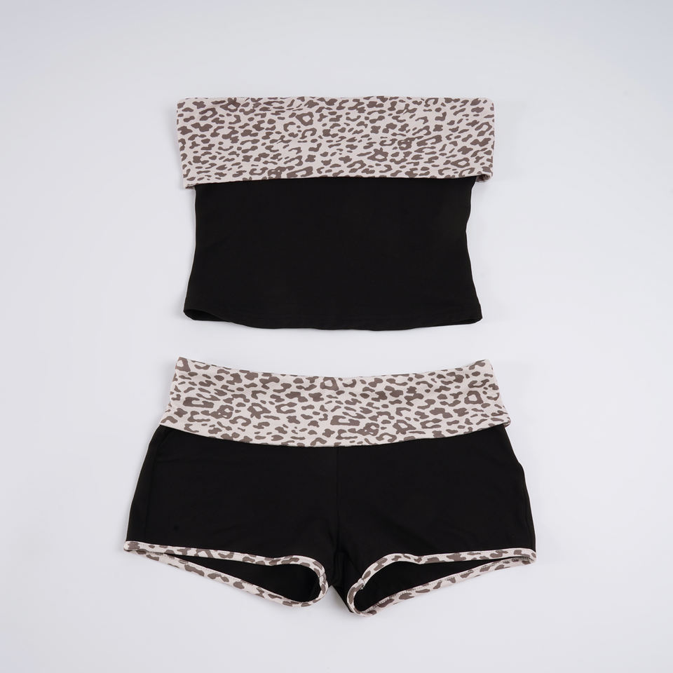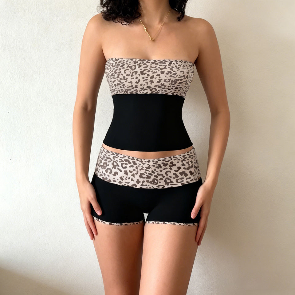 ชุดเซ็ตสองชิ้น กางเกงขาสั้นทรงคอร์เซ็ท ลายเสือดาว แต่งผ้าแบบแพทช์เวิร์ค เสื้อทรงเข้ารูป กางเกงขาสั้นทรงบ็อกเซอร์ สไตล์เซ็กซี่ลำลอง ชุดเซ็ตสุดเท่