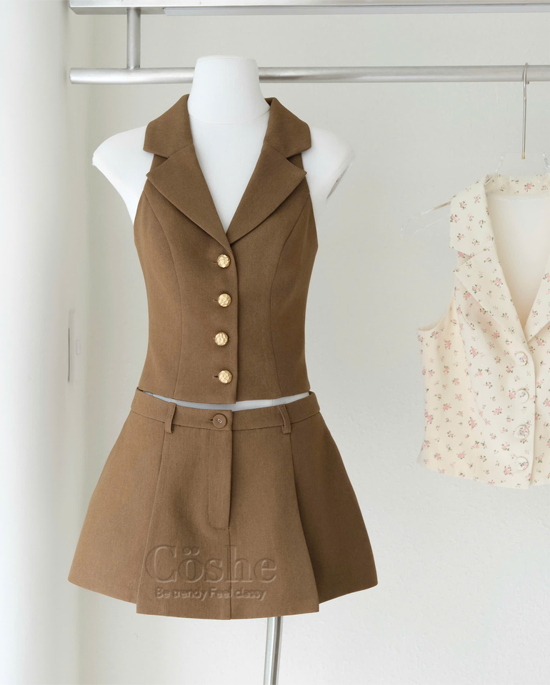 Coshe maree ชุดเสื้อกั๊ก Kaki นุ่มหรูหราและกระโปรงทรงเอทันสมัยสไตล์ผู้หญิงสำหรับใส่ในสำนักงานทุกวัน