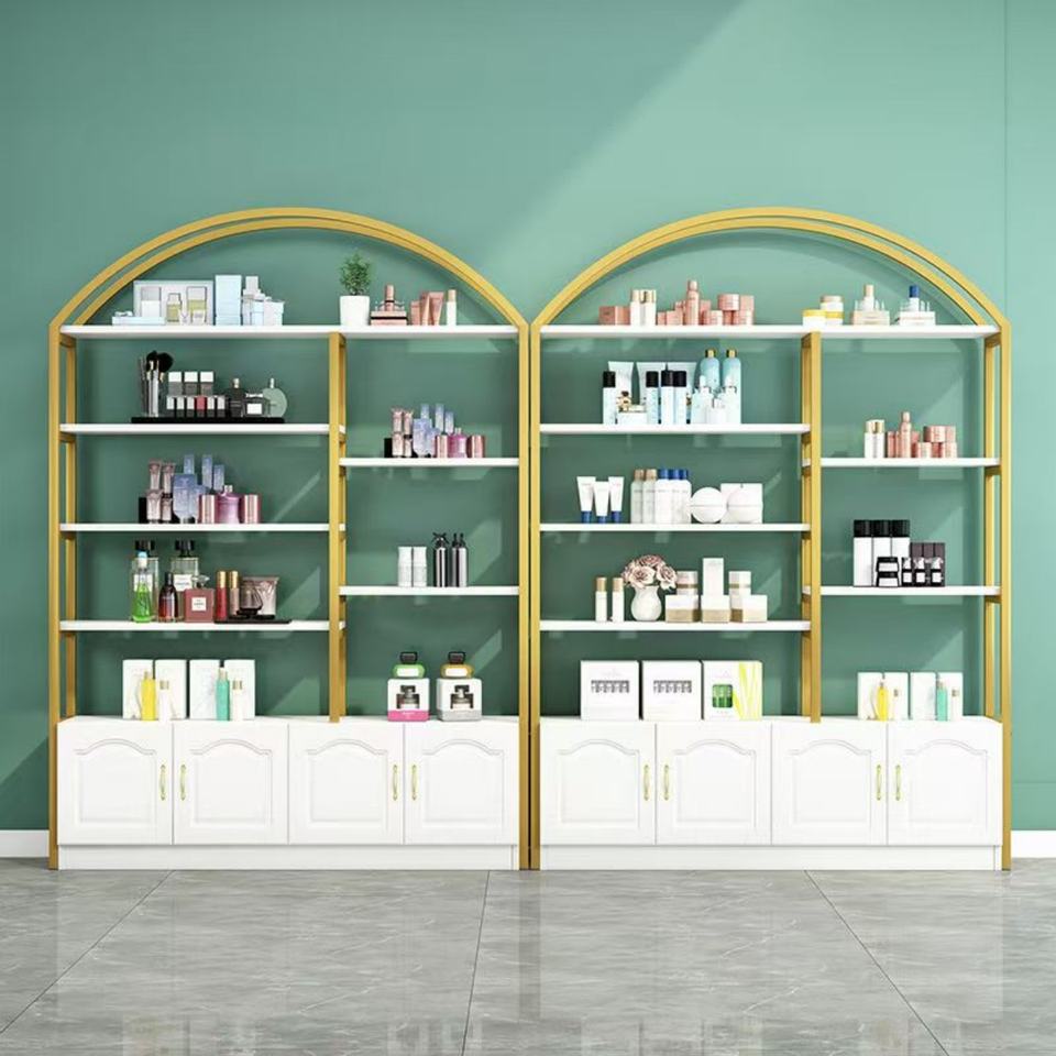 ชั้นวางเครื่องสำอางแบบกำหนดเองสำหรับร้านค้าปลีก พร้อมไฟ LED ทำจากไม้และกระจก สำหรับจัดแสดงสินค้าเครื่องสำอาง