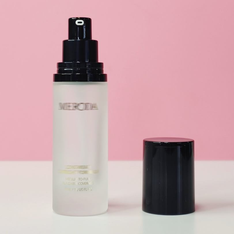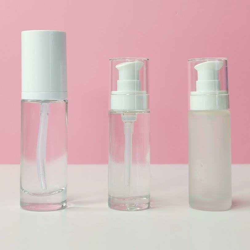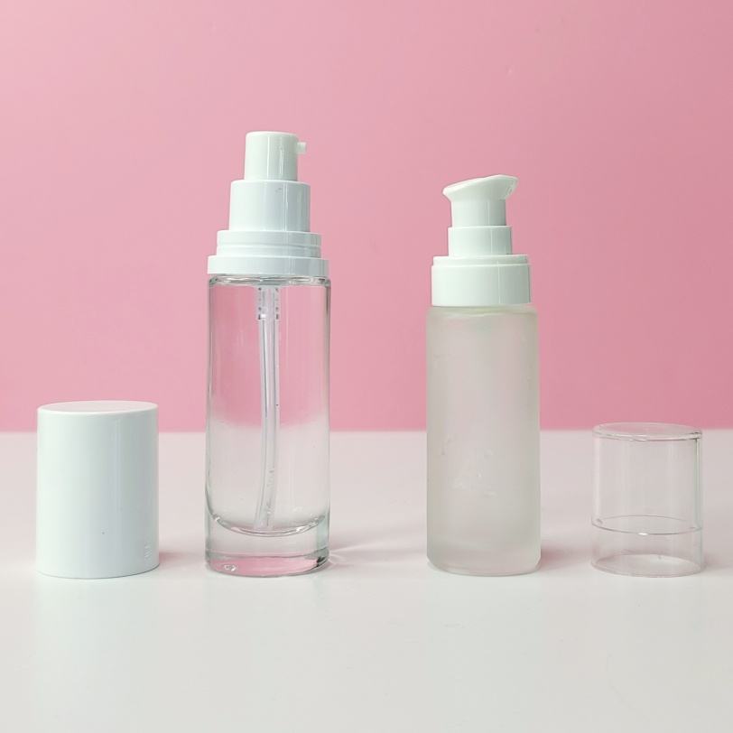 ขวดบรรจุภัณฑ์เครื่องสำอางแบบแก้วฝ้าพร้อมหัวปั๊มสุญญากาศ ขวดแก้วใสสำหรับรองพื้นชนิดน้ำ