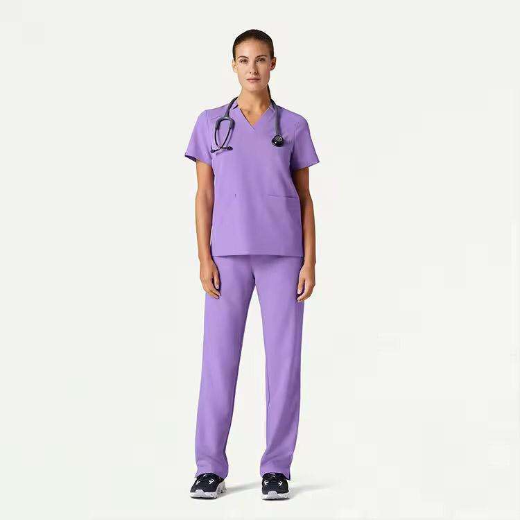 ชุดยูนิฟอร์มพยาบาลแบบสครับสำหรับแพทย์ผู้หญิงในโรงพยาบาล คอซิป แขนสั้น มีกระเป๋าสองชั้น