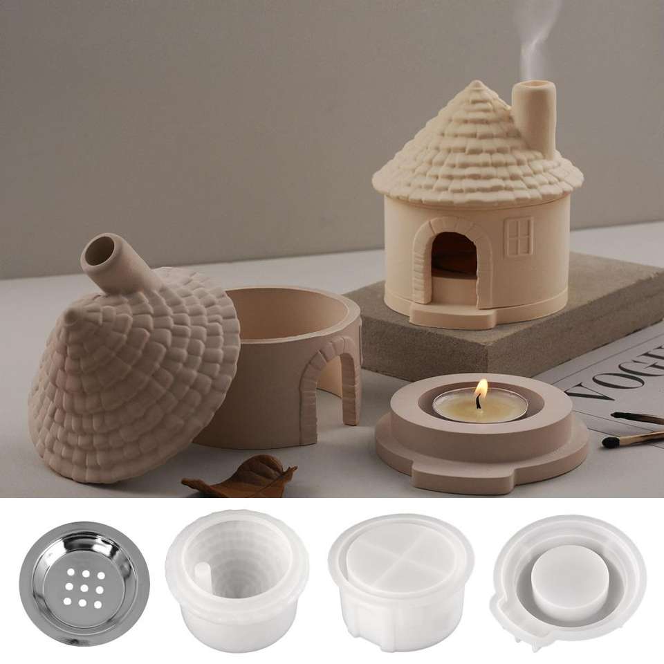 Cottage House Chimney Candlestick Aromatherapy Jar Aromatherapy Stove Gypsum Cement Resin Silicone Mold