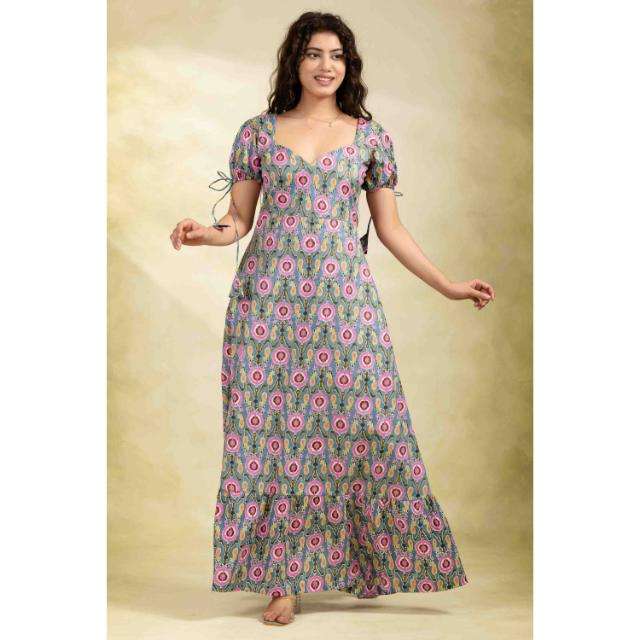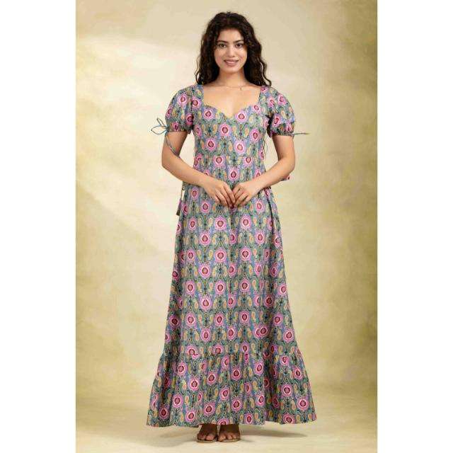 เดรสยาวพิมพ์ลายผ้าฝ้ายสำหรับผู้หญิง ชุดแม็กซี่โบโฮอินเดียทำมือ ชุดใส่ไปเที่ยวทะเลฤดูร้อน ชุดลำลองสำหรับงานเทศกาล