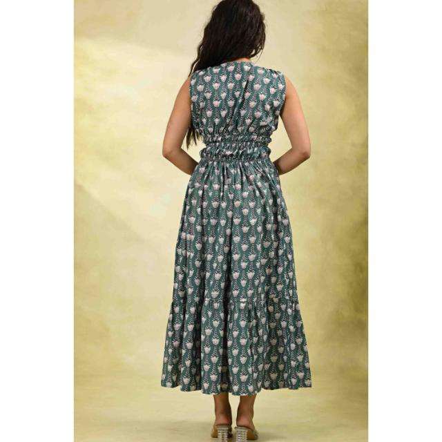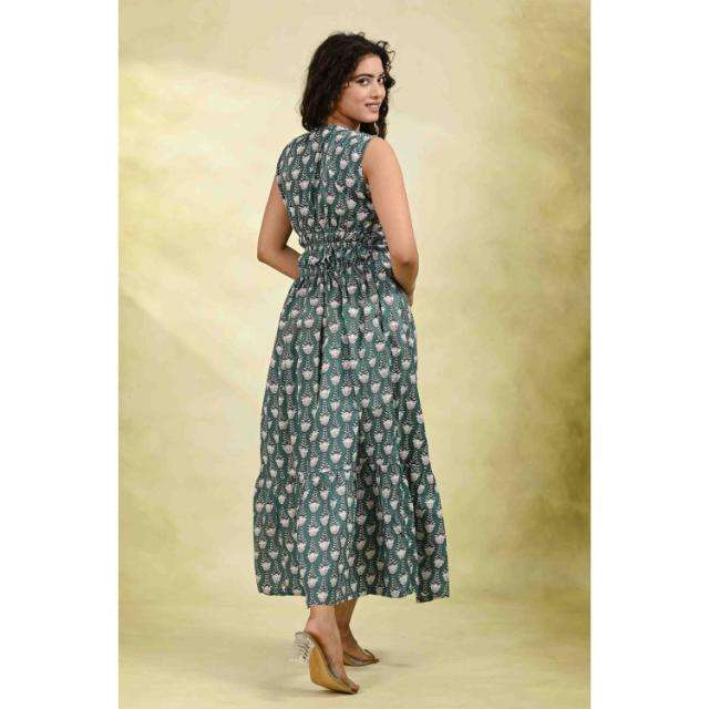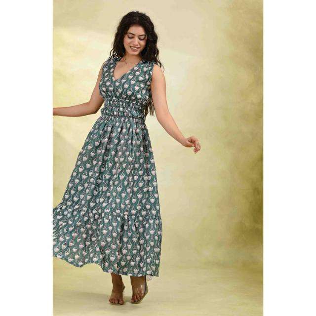 เดรสยาวพิมพ์ลายผ้าฝ้ายสำหรับผู้หญิง ชุดแม็กซี่โบโฮอินเดียทำมือ ชุดใส่ไปเที่ยวทะเลฤดูร้อน ชุดลำลองสำหรับงานเทศกาล