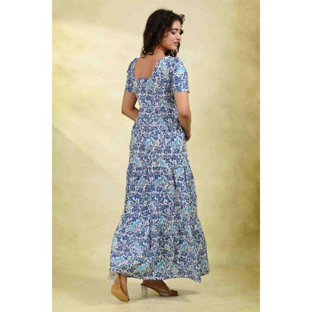 เดรสยาวพิมพ์ลายผ้าฝ้ายสำหรับผู้หญิง ชุดแม็กซี่โบโฮอินเดียทำมือ ชุดใส่ไปเที่ยวทะเลฤดูร้อน ชุดลำลองสำหรับงานเทศกาล