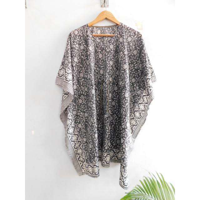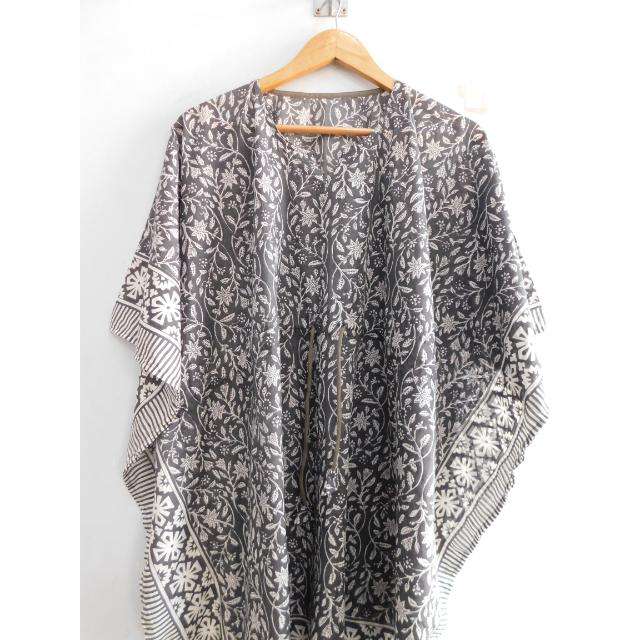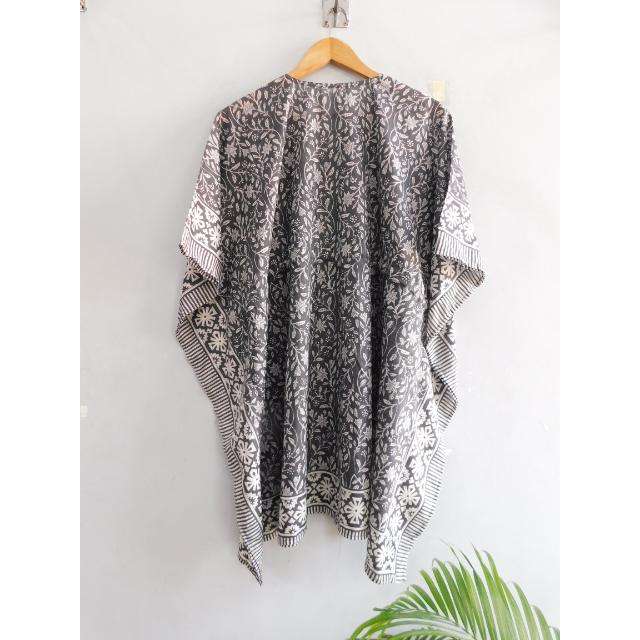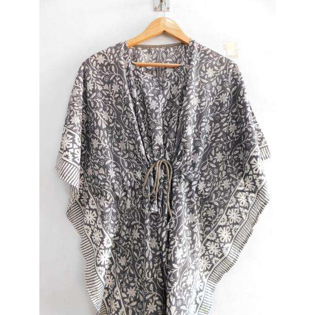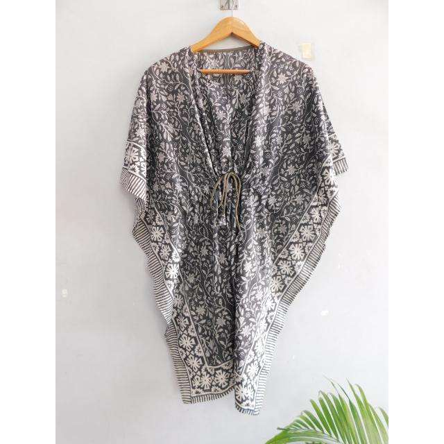 ชุดเดรสคาฟทันทรงปล่อยชายกระโปรง คอวี แขนทรงปีกค้างคาว ลายพิมพ์บล็อกผ้าฝ้าย งานแฮนด์เมด สไตล์โบโฮ หลวมๆ ใส่คลุมชุดว่ายน้ำ เหมาะสำหรับใส่ไปทะเลในฤดูร้อน