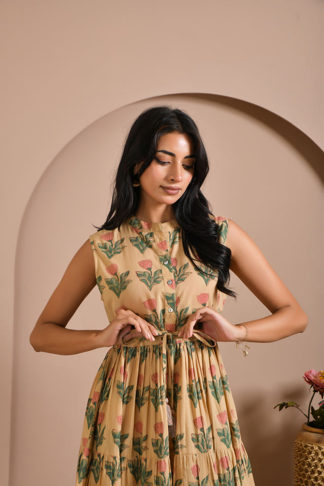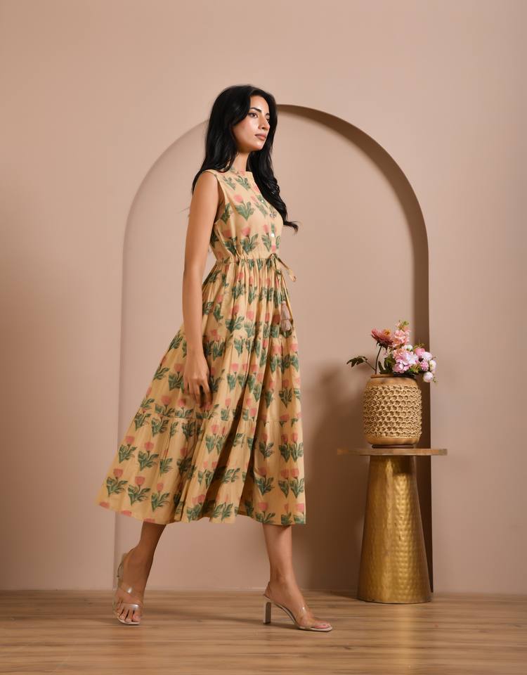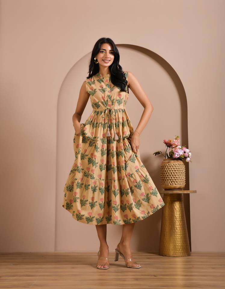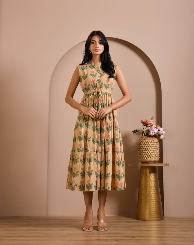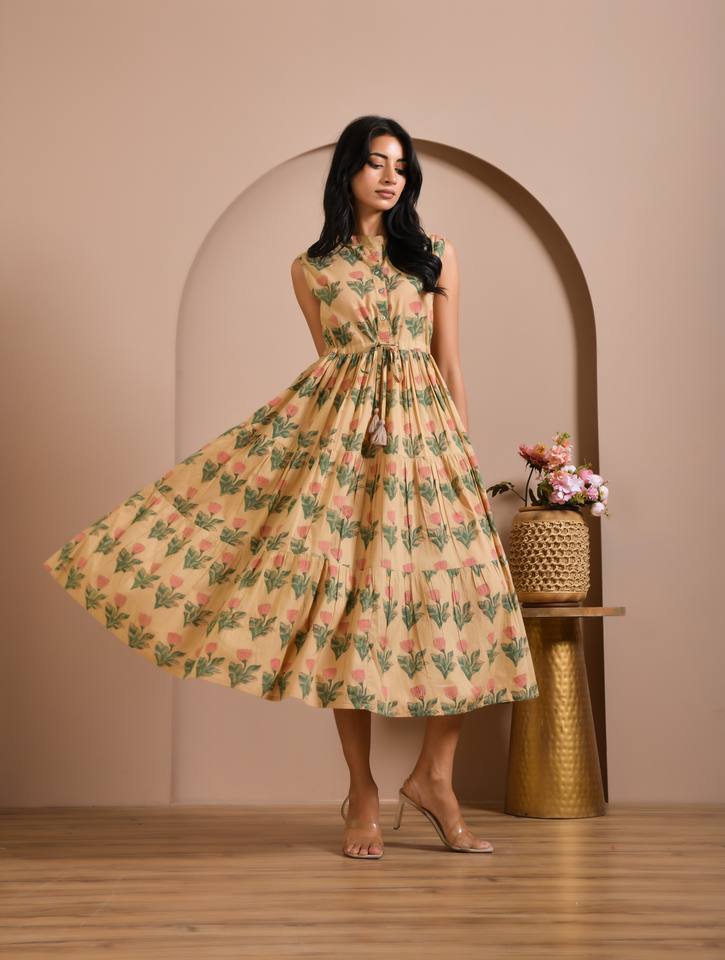 ชุดเดรสผ้าฝ้ายพิมพ์ลายแบบไม่มีแขนสำหรับผู้หญิง สั่งซื้อจำนวนมาก ผู้ส่งออกอินเดีย ผลิตแบบ OEM ขนาดและฉลากตามสั่ง