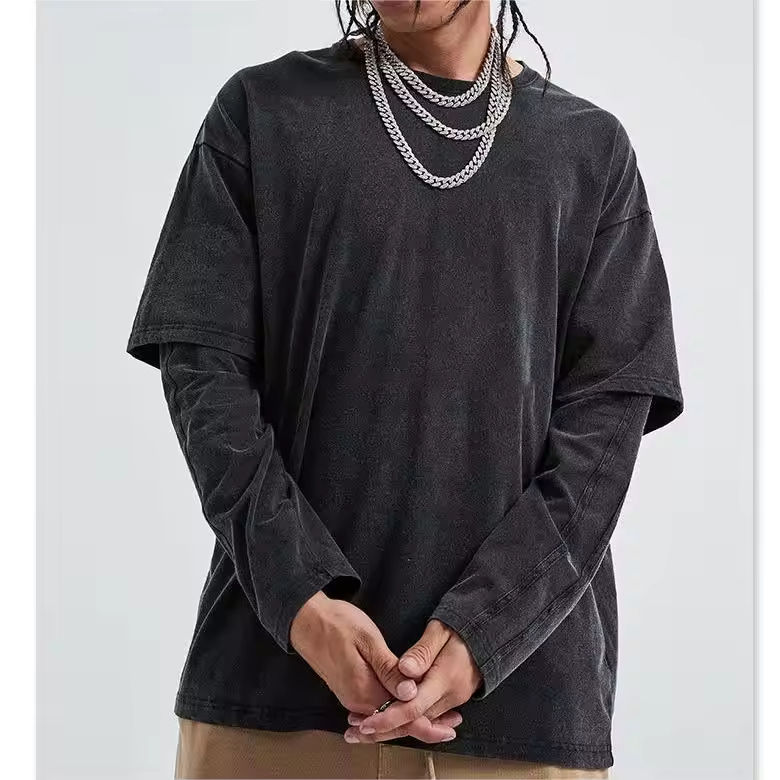 เสื้อยืดผ้าฝ้ายแขนสองชั้นขนาดใหญ่สำหรับผู้ชายลดไหล่ลายพิมพ์ดิจิตอลยาวสองชั้น