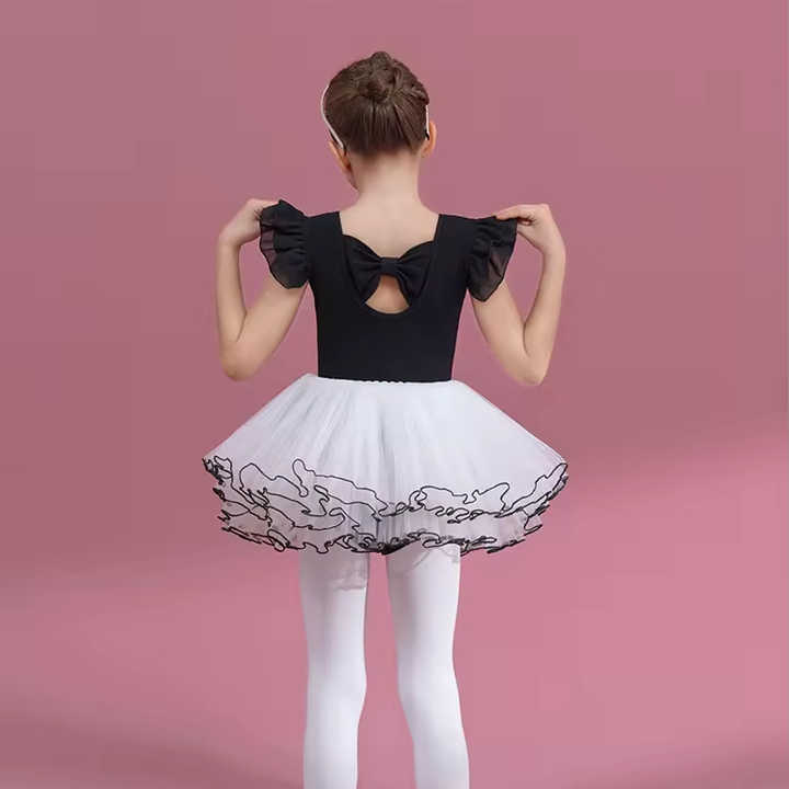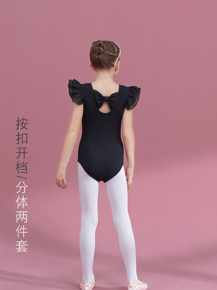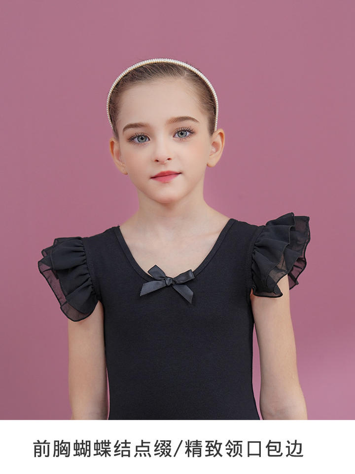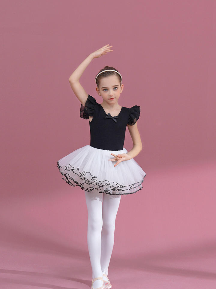ชุดเต้นรำผ้าฝ้ายแขนสั้นสีดำสำหรับเด็กผู้หญิงชุดสอบผ้าโปร่งสำหรับใส่ฤดูร้อน