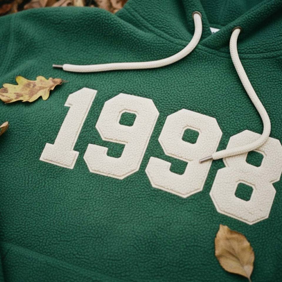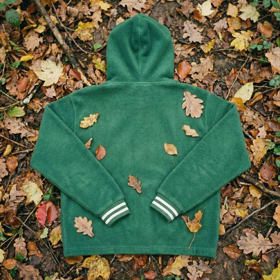 เสื้อฮู้ดดี้ผ้าฝ้ายฟลีซสีเขียวป่าฤดูหนาว แต่งแพทช์เชนิลล์วินเทจ ปักลาย 3 มิติ ย้อมสีแบบไทได ปี 1998 ทรงโอเวอร์ไซส์ ปลายแขนเสื้อลายทางด้านหน้า