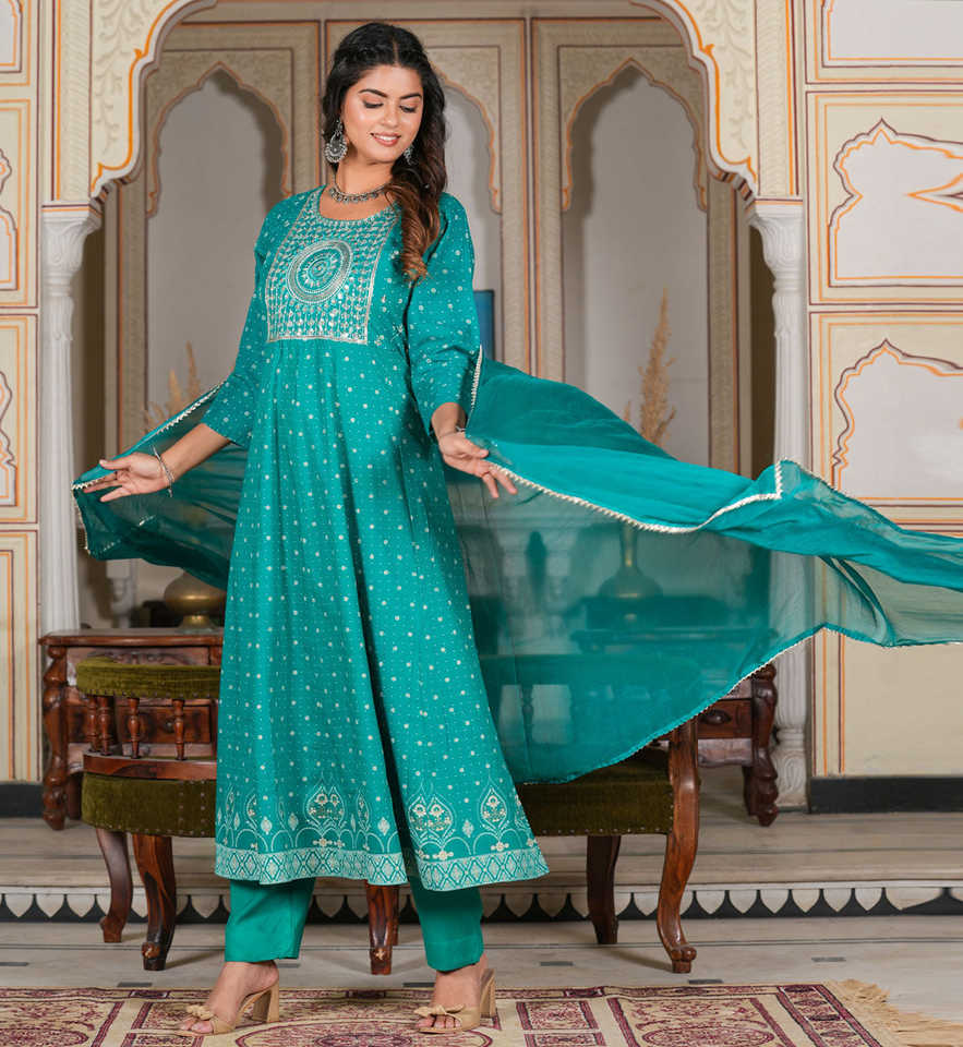 Anarkali Kurta ผ้าฝ้ายลำลองยาวถึงข้อเท้าพิมพ์ลายดอกไม้พร้อมพิมพ์ lehriya Palazzo & dupatta สำหรับผู้หญิงเป็นมิตรกับสิ่งแวดล้อม