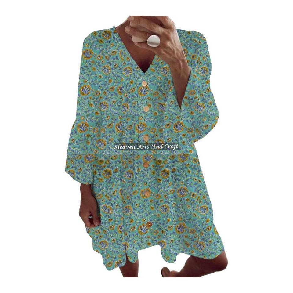 เสื้อคุर्ติผ้าฝ้ายพิมพ์ลายด้วยมือ / เสื้อผ้าชาติพันธุ์ / เสื้อผ้าอินเดียและปากีสถาน เสื้อคลุมชายหาดระบายอากาศได้ดี