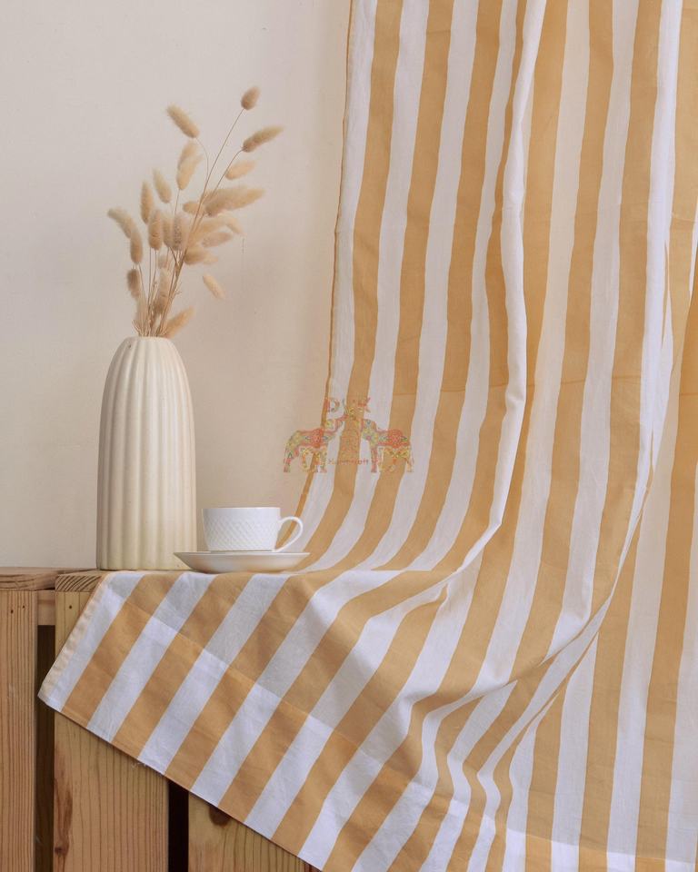 ชุดผ้าม่านลายทางสีเหลืองผ้าฝ้ายพิมพ์ลายด้วยมือ 2 ผืน สำหรับห้องนั่งเล่นและห้องนอน ผ้าม่านโปร่งแสง