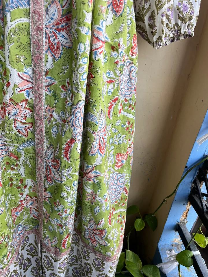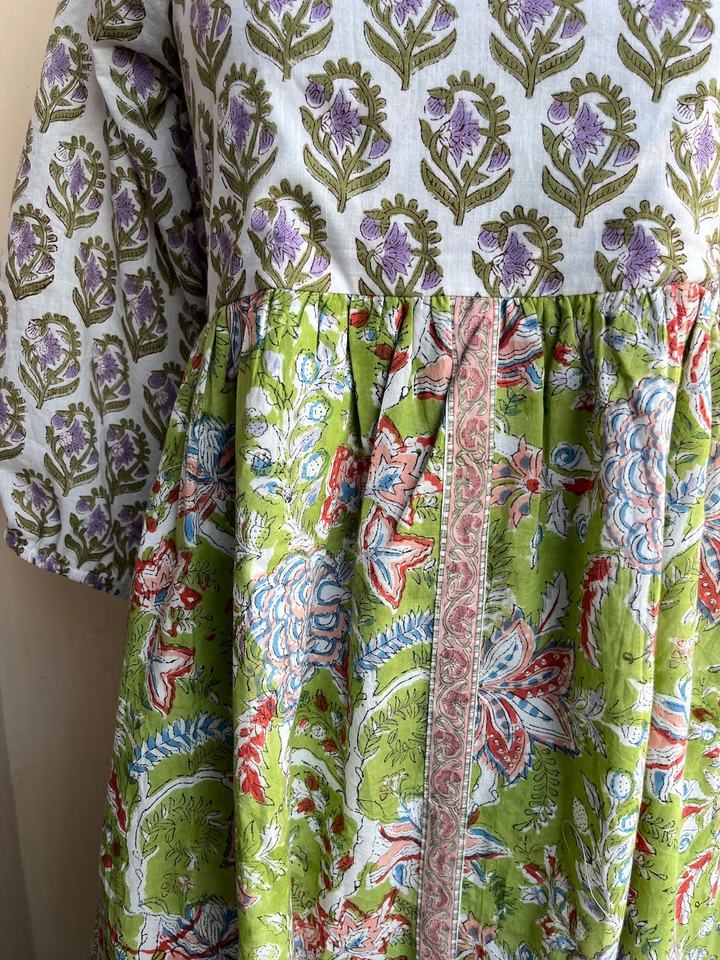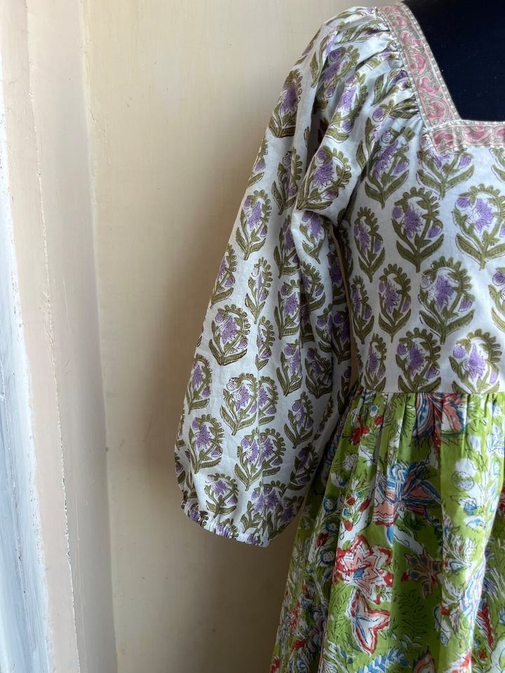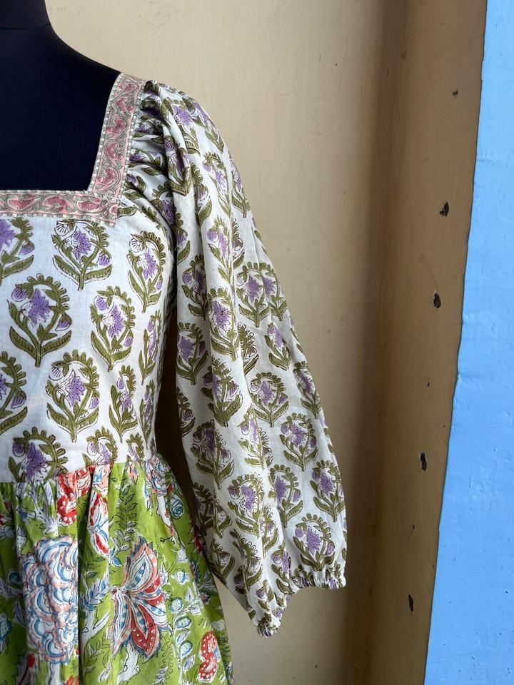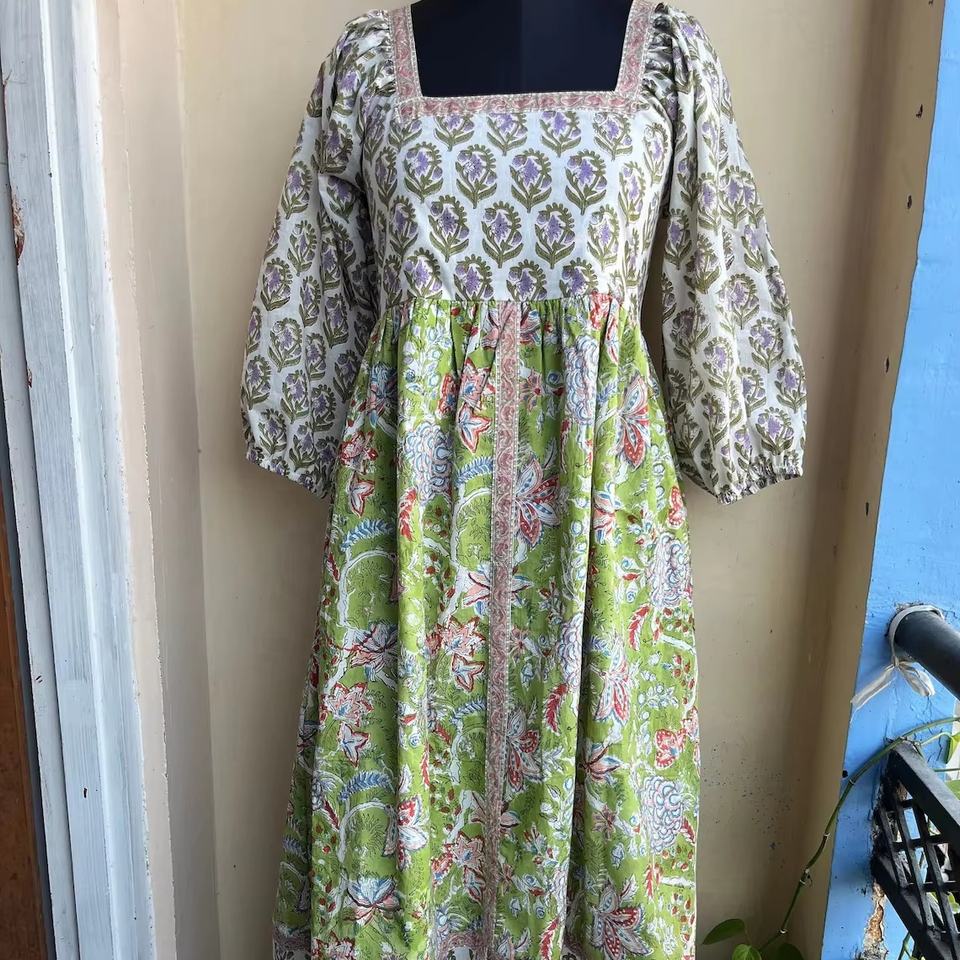 เดรสผ้าฝ้ายคอเหลี่ยมพิมพ์ลายบล็อกมือแบบมิดิเดรส คอเหลี่ยม เดรสลายดอกไม้ เดรสยาวแม็กซี่สำหรับผู้หญิง