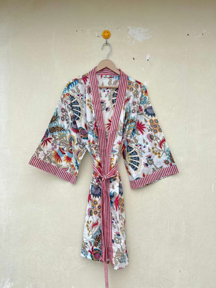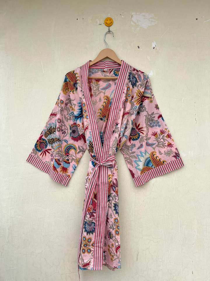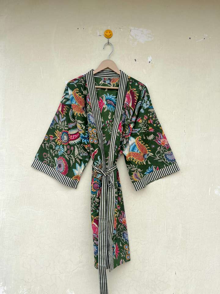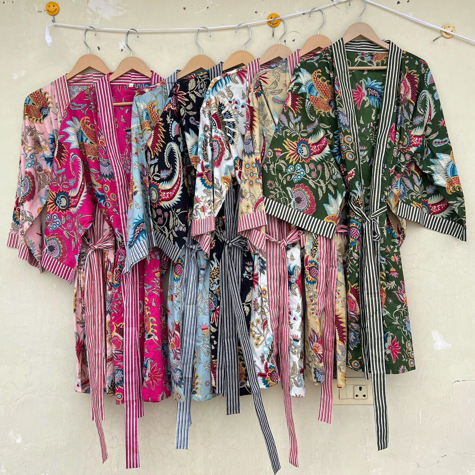 ชุดคลุมกิโมโนผ้าฝ้ายลายบล็อกพิมพ์ ชุดคลุมสำหรับเพื่อนเจ้าสาว ชุดนอนฤดูร้อน ไซส์เดียว ของขวัญสำหรับแขกในงานเทศกาล ชุดคลุมอาบน้ำสไตล์โบฮีเมียน