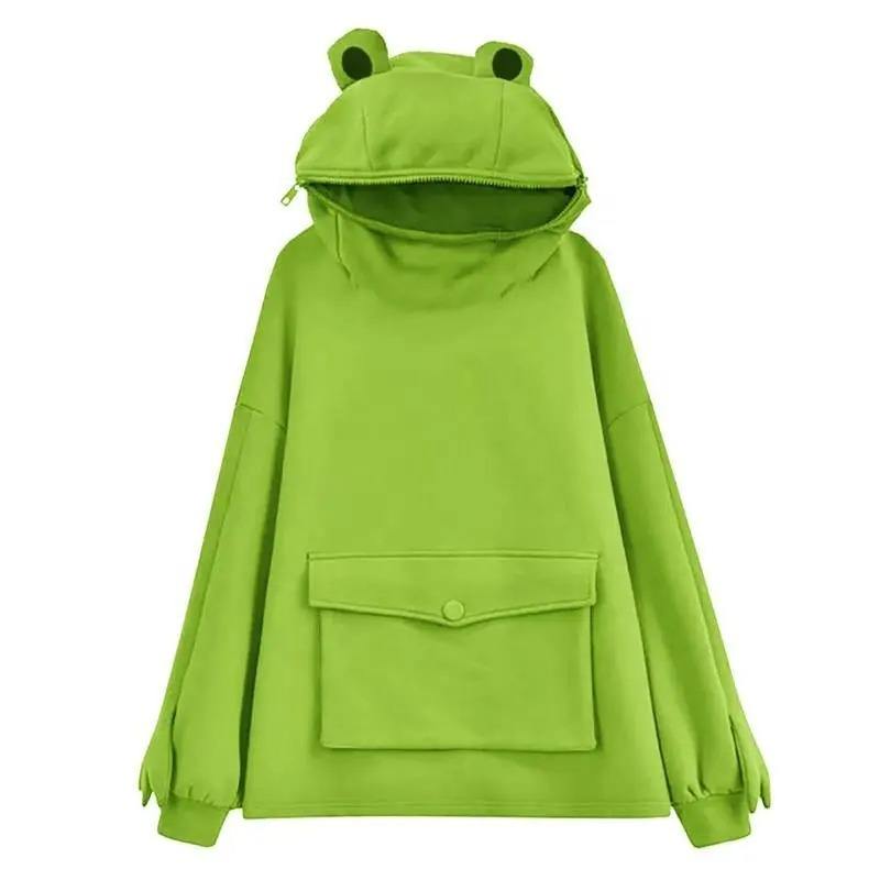 เสื้อฮู้ดสวมหัวลายกบตัวใหญ่สำหรับผู้หญิง, ผ้าฝ้ายสไตล์เกาหลีมีฮู้ดและสเวตเชิ้ตลายการ์ตูนพิมพ์โลโก้