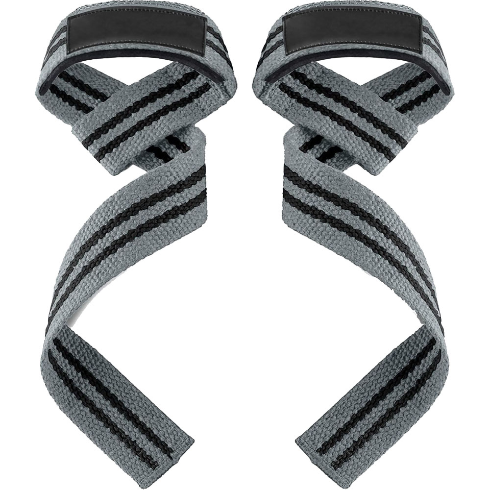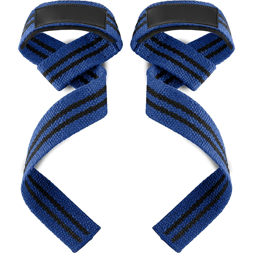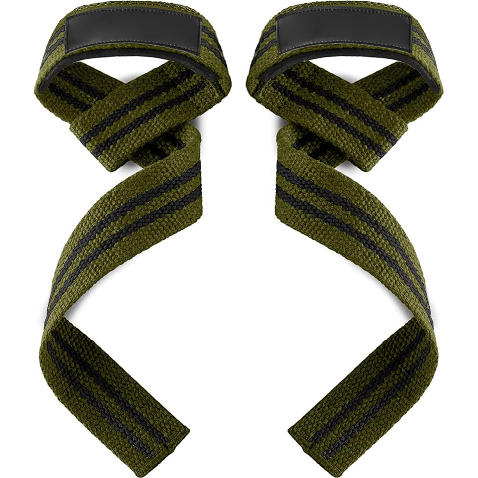สายรัดยกน้ำหนักผ้าฝ้ายสีเขียวอมฟ้าลายทาง พร้อมที่รัดข้อมือปรับได้ ใช้ได้ทั้งชายและหญิง สำหรับการฝึกยกบาร์เบลหนัก เดดลิฟท์ และการออกกำลังกาย