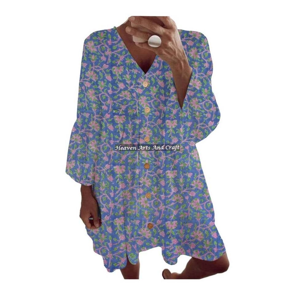 ชุดเดรสผ้าฝ้ายพิมพ์ลายฤดูใบไม้ผลิฤดูร้อน แขนทรงระฆัง ชุดเดรสฤดูร้อน ชุดเดรสฤดูใบไม้ผลิฤดูร้อน คอลเลคชั่นผ้าฝ้ายอินเดีย พิมพ์ลายด้วยมืออย่างสวยงาม