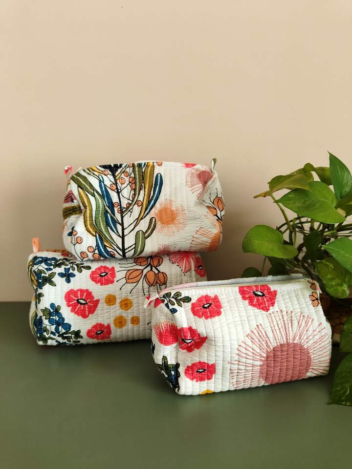 ชุดกระเป๋าเครื่องสำอาง 3 ชิ้น ผ้าฝ้ายลายควิลท์ Quince Life ดีไซน์สี่เหลี่ยมลำลอง ลายดอกไม้พิมพ์ลาย กระเป๋าใส่เครื่องสำอางสีขาวลายทุ่งหญ้า