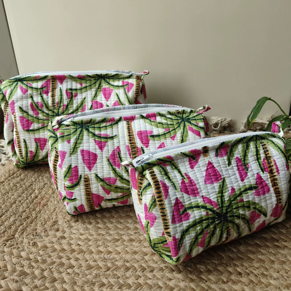 ชุดกระเป๋าเครื่องสำอาง 3 ชิ้น ผ้าฝ้ายลายดอกไม้ แบรนด์ Quince Life Casual Cotton Quilted งานแฮนด์เมด พร้อมซิป