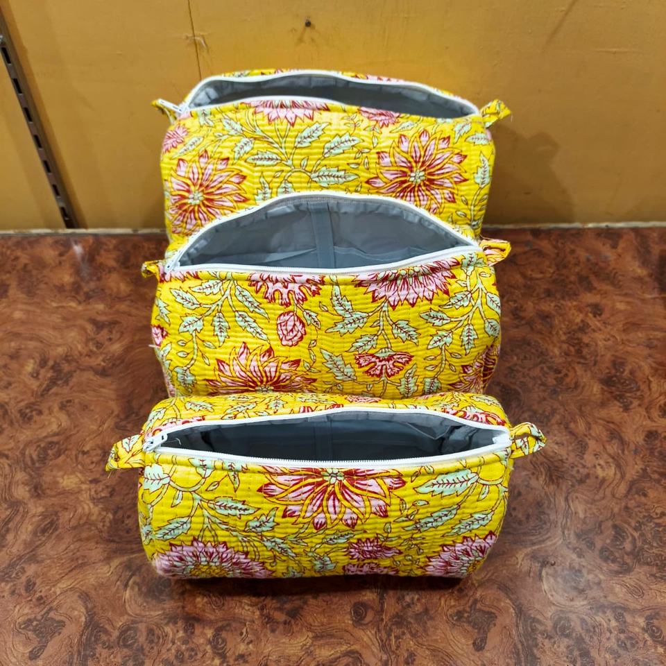 ชุดกระเป๋าเครื่องสำอางแบบควิลท์ผ้าฝ้ายรักษ์โลก 3 ชิ้น ปิดซิป ความจุเยอะ ลายดอกไม้ สีเหลืองผสมสีอื่นๆ พกพาสะดวก