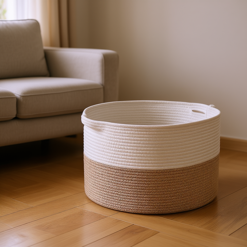ตะกร้าเก็บของเชือกฝ้าย 87 ลิตร ทรงกระบอกสานมือ สไตล์มินิมอล สำหรับจัดระเบียบห้องนั่งเล่น