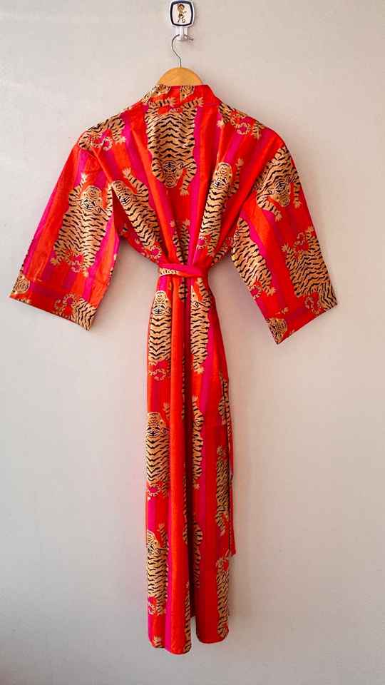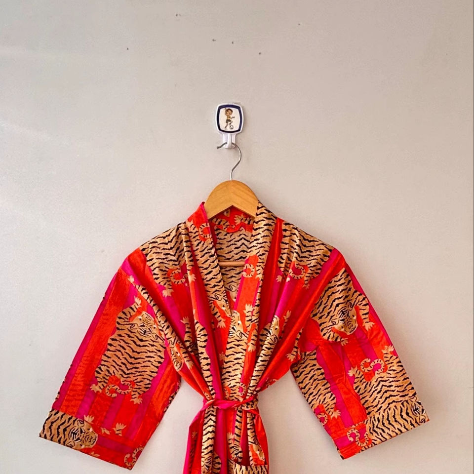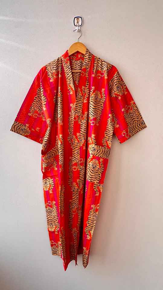 ชุดคลุมกิโมโนผ้าฝ้ายพิมพ์ลายซาฟารีสำหรับผู้หญิง แบบพันรอบตัว ฤดูร้อน/ฤดูใบไม้ผลิ ทำมือ แห้งเร็ว ระบายอากาศได้ดี เสื้อคลุมใส่ในบ้าน ลายชนเผ่า ทำมือ