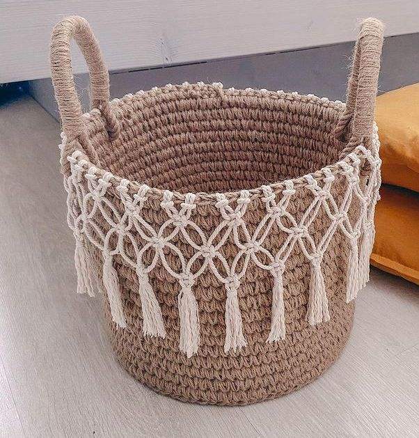 ตะกร้าเก็บสายฝ้ายมาคราเม่ถูกสร้างขึ้นสำหรับการถือเสื้อผ้าหรือผ้าขนหนูสำหรับผลิตภัณฑ์สำหรับเด็กในการตกแต่งอย่างสันติ