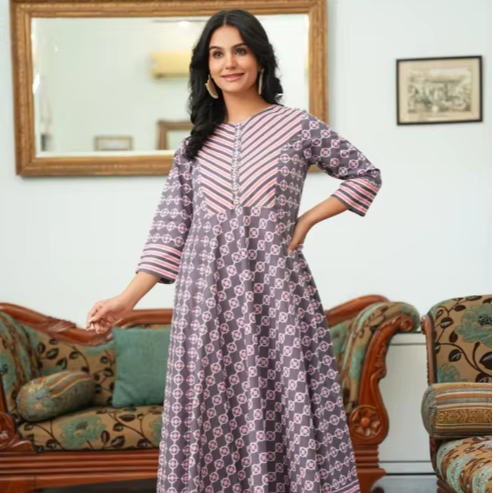 Anarkali kurta ผ้าฝ้ายพิมพ์ลายดอกไม้ผ้านุ่มใส่สบายสไตล์อินเดียสง่างามสำหรับรูปลักษณ์ดั้งเดิม