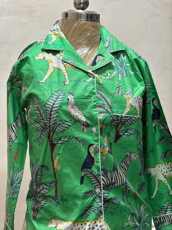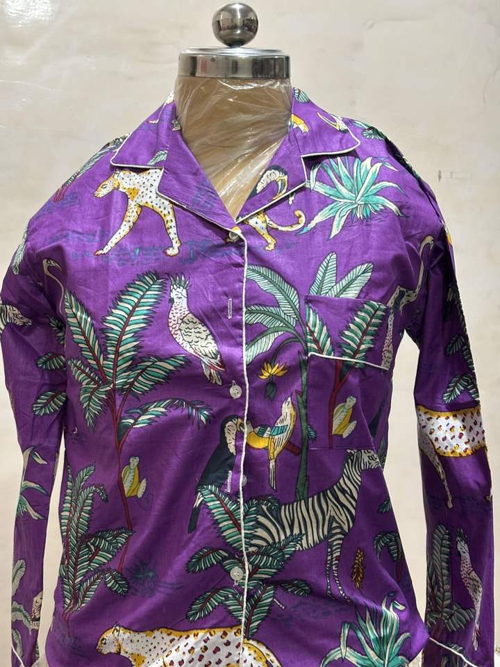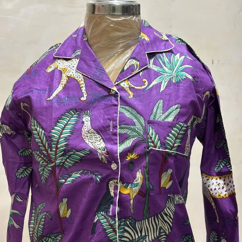 ชุดนอนผ้าฝ้ายสีม่วงและสีเขียวพิมพ์ลายป่า แขนยาว สวมใส่สบาย สำหรับผู้หญิง ราคาขายส่ง