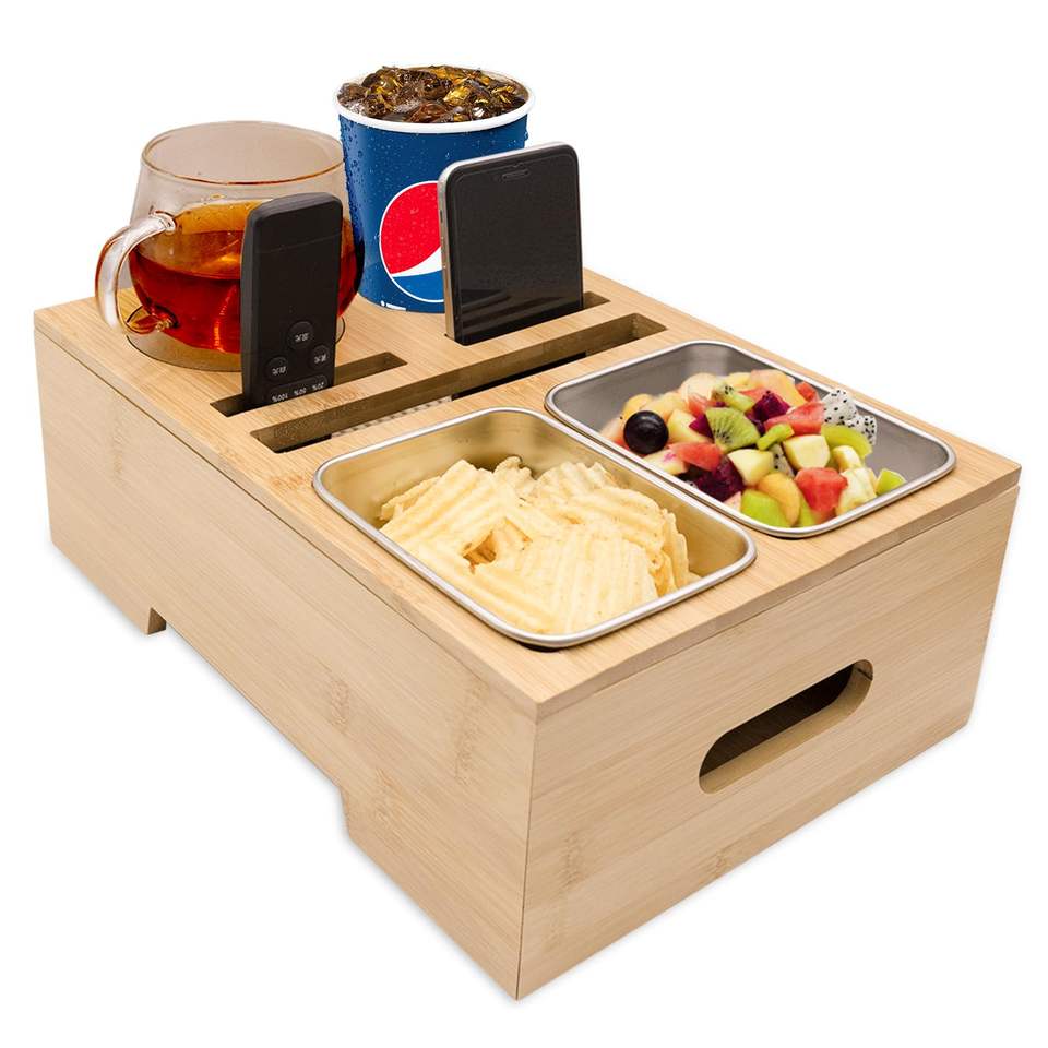 ถาดวางแก้วน้ำบนโซฟา ถาดวางของว่างบนโซฟาไม้ไผ่ พร้อมฝาปิด ที่วางเครื่องดื่มและอาหารสำหรับเตียง ที่จัดระเบียบเบาะรถยนต์ ที่วางของบนโซฟา