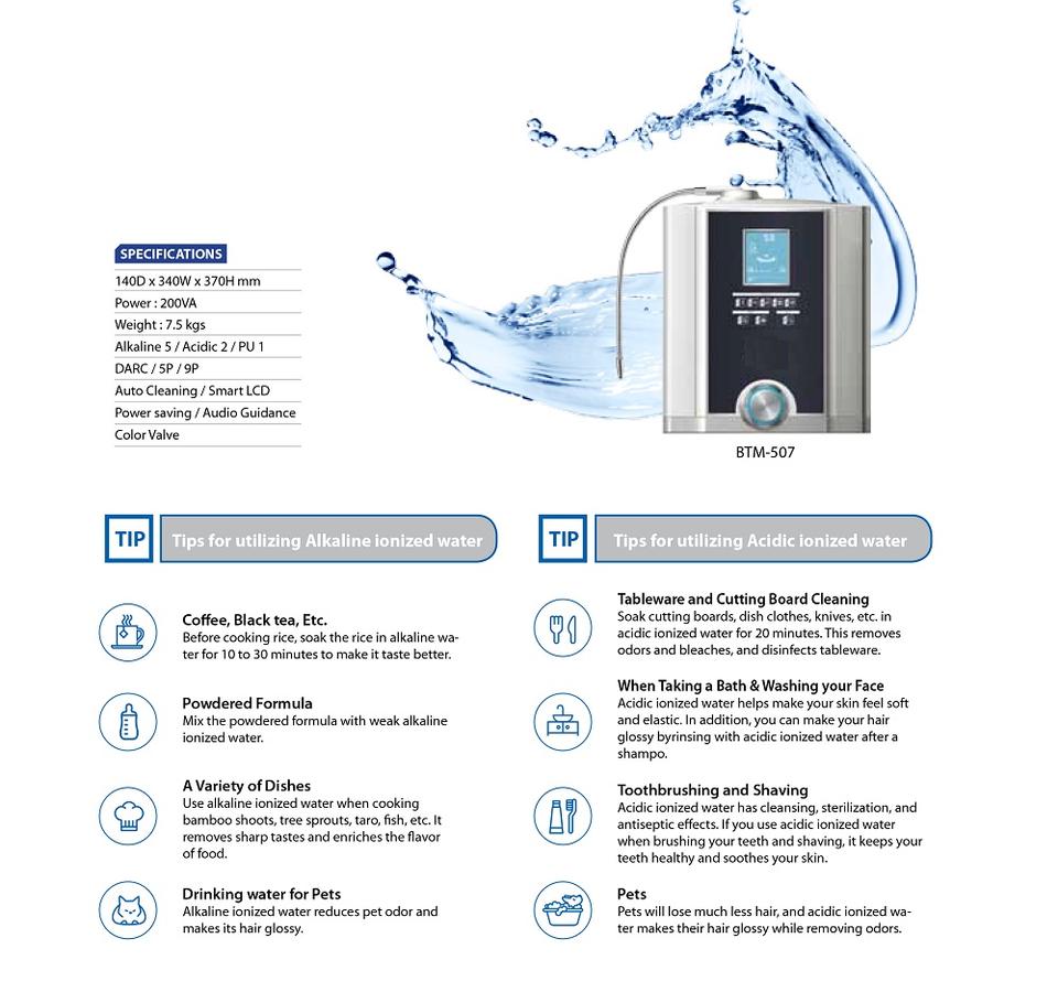 เครื่องกรองน้ำอัลคาไลน์แบบตั้งโต๊ะ รุ่น BTM507 คุณภาพสูง ผลิตในเกาหลี พร้อมไส้กรองสองชั้น 5 7 9 แผ่น ใช้ไฟฟ้า วัสดุพลาสติก สำหรับใช้ในครัวเรือน 200 GPD