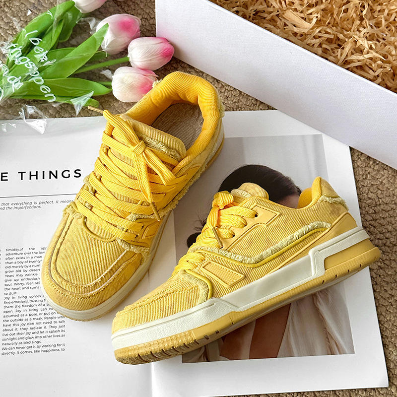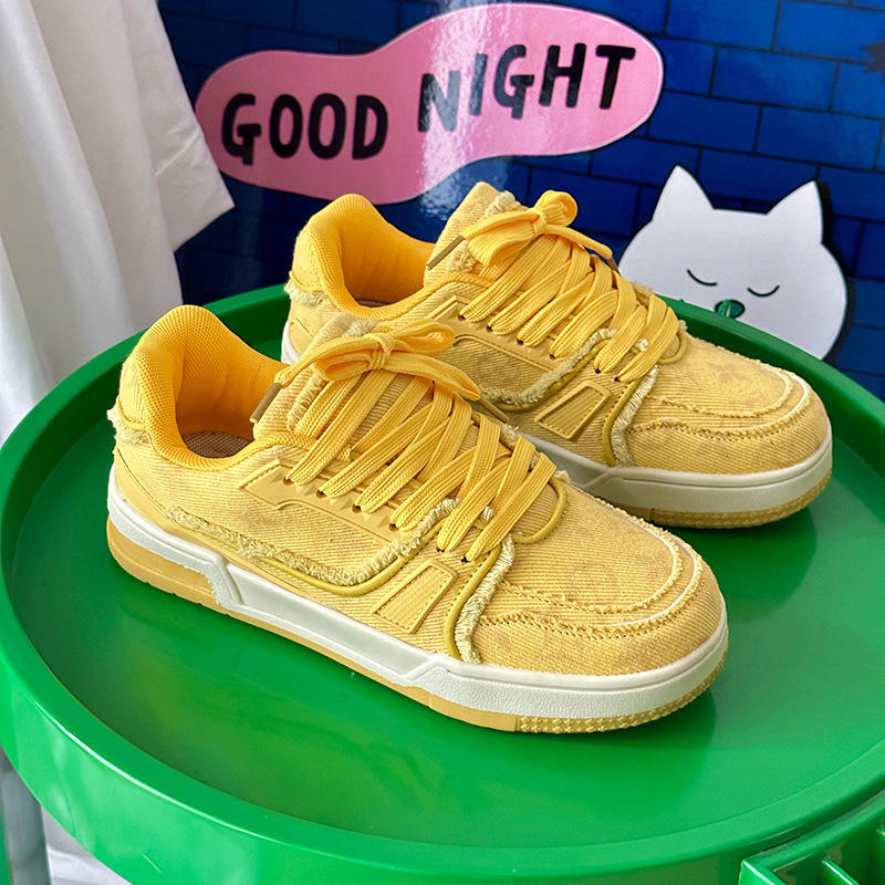 รองเท้าลำลองสำหรับผู้ชายแบบสปอร์ตสำหรับคู่รัก-ผ้ายีนส์สีเหลืองมีขอบรองเท้าโลฟเฟอร์แนวเรโทรสำหรับผู้หญิงรองเท้าแพลตฟอร์ม