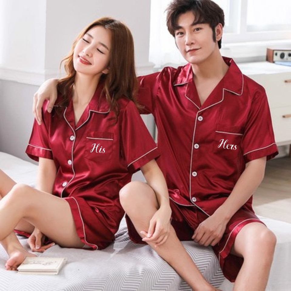 ชุดนอนเข้าคู่ผ้าซาตินนุ่มลื่นกางเกงขายาวแขนยาวปรับแต่งได้ของขวัญคริสต์มาสวาเลนไทน์
