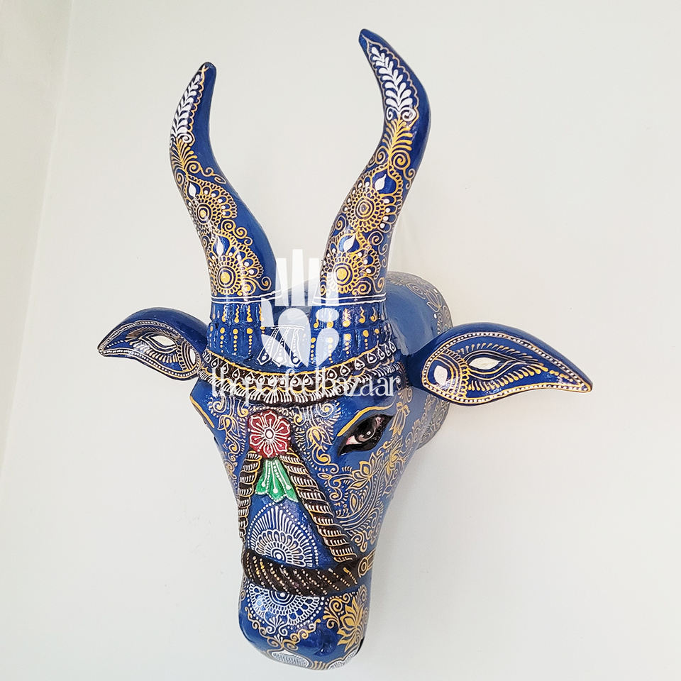 งานศิลปะตกแต่งผนังลายหัววัวสีน้ำเงินสไตล์อาร์ตเดโค สำหรับตกแต่งบ้านและสำนักงาน งานฝีมือไม้ - ของขวัญวันดิวาลีและวันครบรอบ