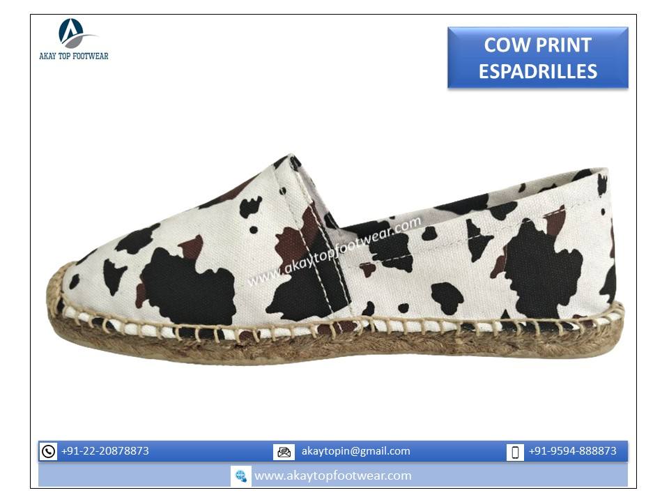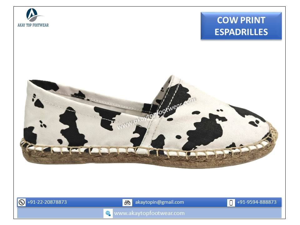 รองเท้าเอสพาดริลล์ผ้าใบน้ำหนักเบาระบายอากาศได้ดีพื้นหลังสีขาวพิมพ์ลายวัว