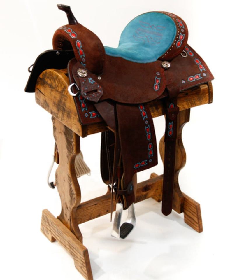 อานม้าคาวบอยหนังแท้สำหรับแข่งบาร์เรลเรซซิ่ง สีชมพู ลายลูกศร พกพาสะดวก ทนทาน ผลิตภัณฑ์สำหรับแข่งม้าจากอินเดีย