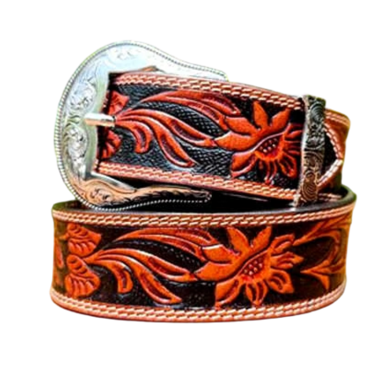 เข็มขัดหนังวัวทำมือสไตล์วินเทจ ดีไซน์ประดับลูกปัด หัวเข็มขัดเหล็กพิมพ์ลายด้วยความร้อน กว้าง 1-1.5 นิ้ว สไตล์ลำลอง