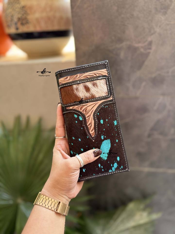 กระเป๋าใส่เงินแบบยาวของผู้ชายหนังวัวทำมือแกะสลักหนังขนสัตว์โลหะขายดีแฟชั่นมีสไตล์มีที่ใส่เงินสดของขวัญสำหรับเขา