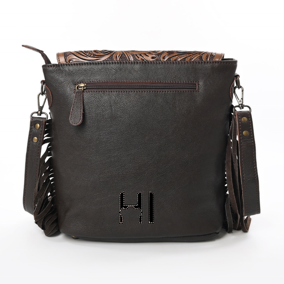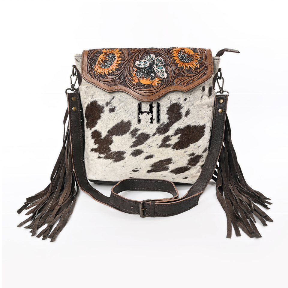 กระเป๋าหนังวัวแท้แบบสะพายข้าง หนังฟอกฝาดแบบวีแกน ปิดด้วยซิป ตกแต่งลายดอกทานตะวันด้วยมือ พร้อมพู่หนังวัว