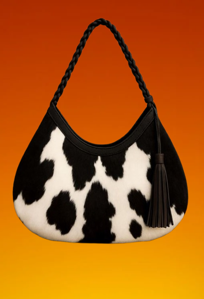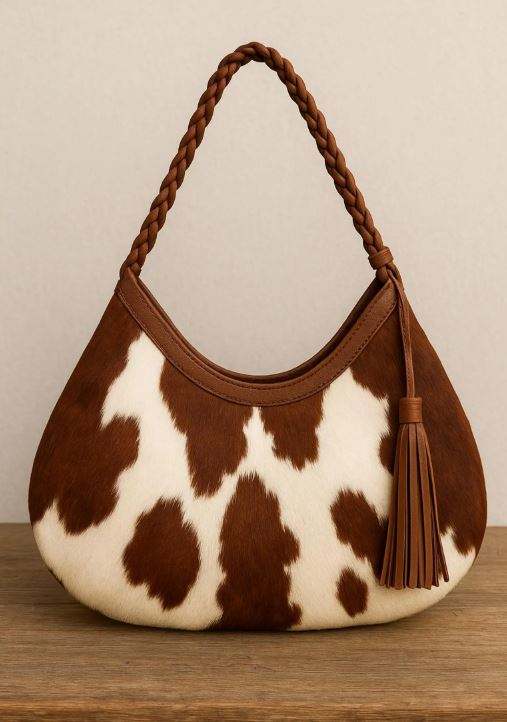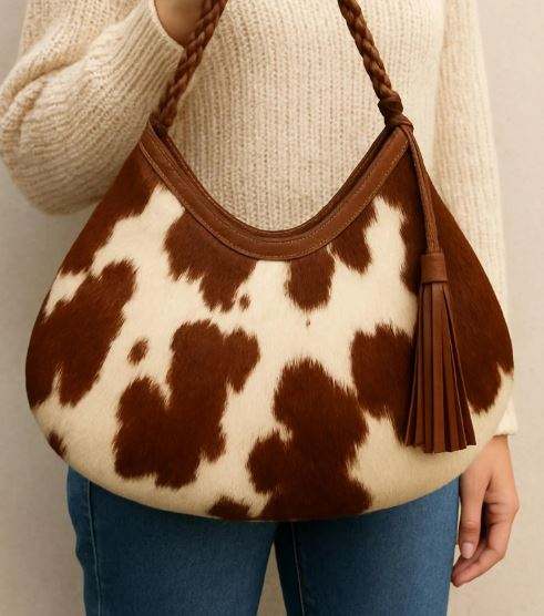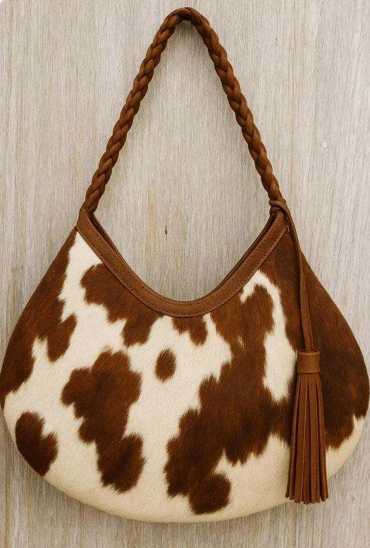 กระเป๋าหนังวัวแบบโฮโบ: หนังมีขนพร้อมหูจับหนังถักสไตล์ตะวันตก