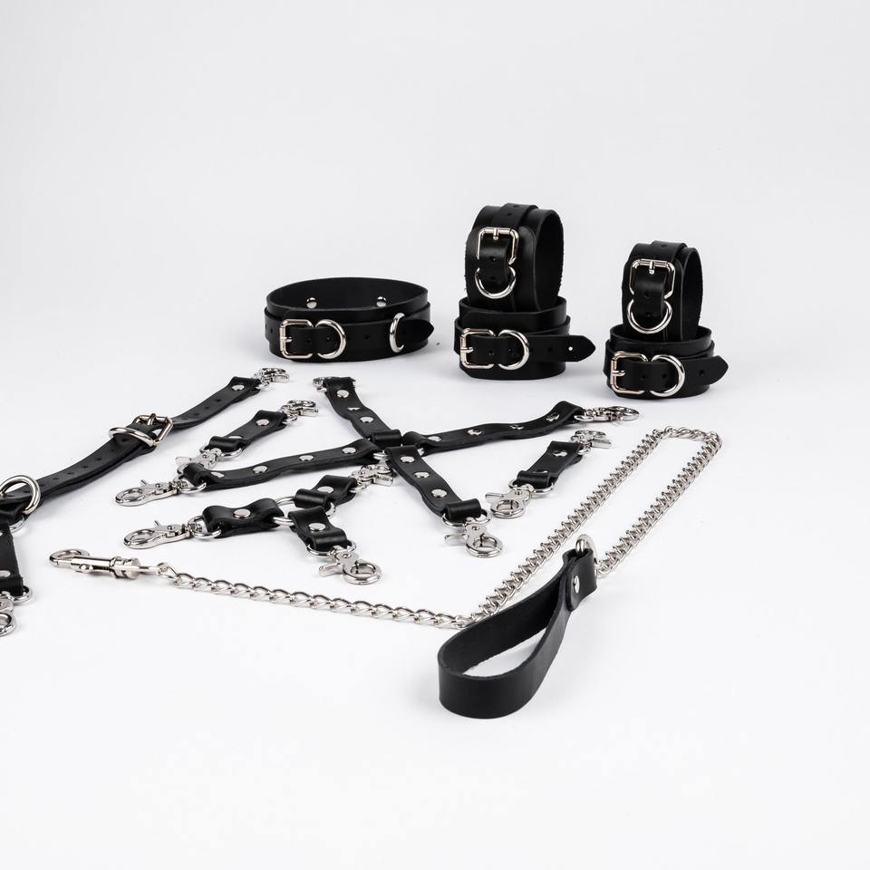 RESTRAINTS, Collar, Rope, spreader bar, Handcuffs, GAG, Blindfold, tickler, legcuffs, Paddle, LeashIncluded Components