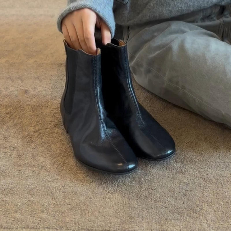 รุ่นหนังวัว~รองเท้าบูทเชลซีสำหรับผู้หญิงสไตล์ฝรั่งเศสและอังกฤษ หัวกลม หนังแท้ รองเท้าบูททรงเรียบบาง ใส่ได้หลากหลาย