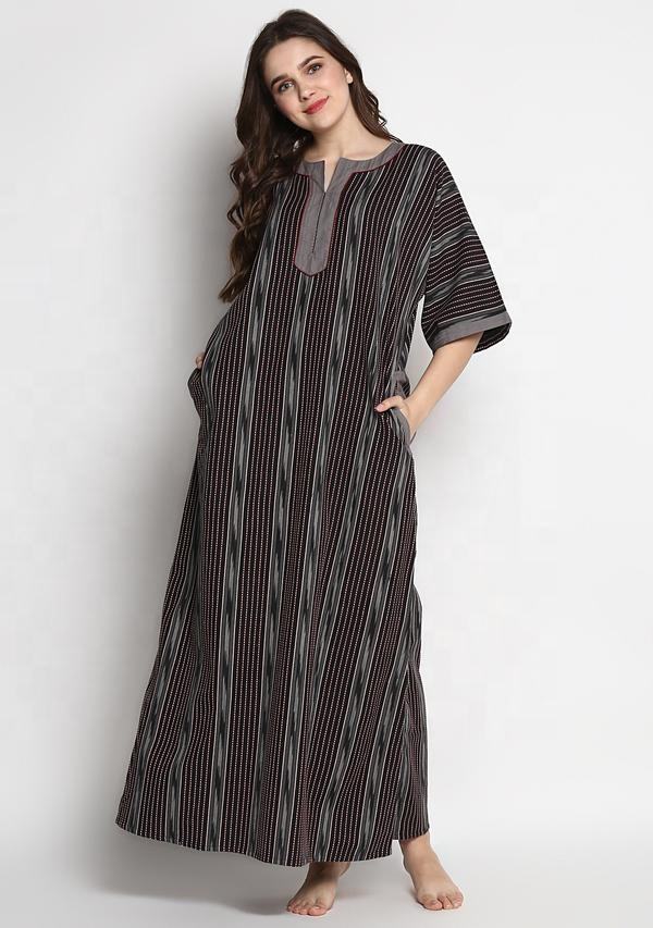 เดรสผ้าฝ้ายพิมพ์ลายทางแขนครึ่งและคอวีชุดเดรสสีดำสีเทาอมเทาสำหรับฤดูร้อน