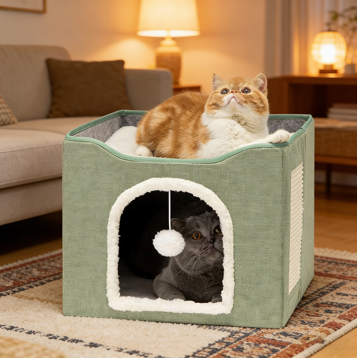 เตียงแมวแบบพับได้พร้อมที่ลับเล็บ บ้านแมวสองชั้นแสนสบายพร้อมเบาะรองนั่งถอดออกได้