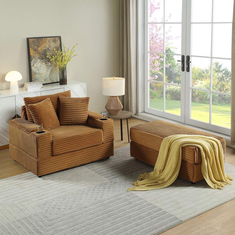 ชุดห้องนั่งเล่นแสนสบาย โซฟาแบบนั่งลึก พร้อมหมอนอิง 2 ใบ และออตโตมัน เหมาะสำหรับความบันเทิงภายในบ้าน